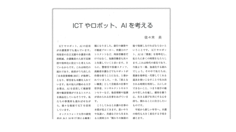 Senior Community 2018 9-10月号に代表の記事が掲載されました。 今回は「ICTやロボット、AIを考える」というテーマで掲載されています。 ICTやロボット、AIの活用が介護業界でも進んでいます。利 … 続きを読む Senior Community 2019 1-2月号に代表の記事が掲載されました。